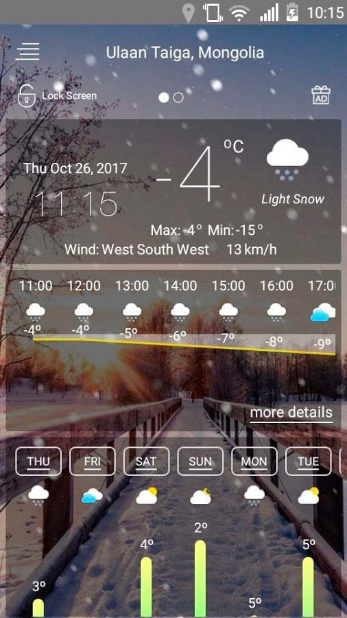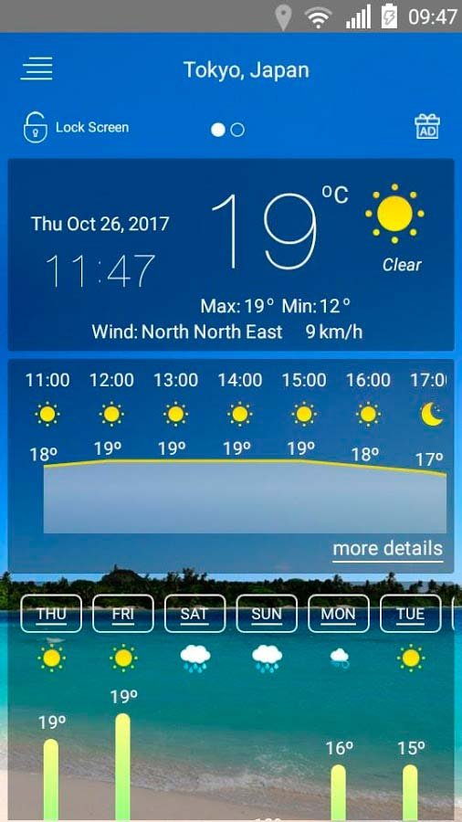 Просто подключайте свое местоположение, и приложение в автоматическом режиме предоставит для вас данные о погоде на ближайшее время. Вы сможете просматривать подробную информацию о любых изменениях в вашем регионе, районе или городе. Узнавайте про изменения температурного режима, скорости и направления ветра, атмосферном давлении и массе других показателей. Это глобальная метеорологическая система, способна доставлять информацию очень точно и в нужном регионе. Теперь вы свободно будете пользоваться собственным погодным приложением, и одеваться по погоде.