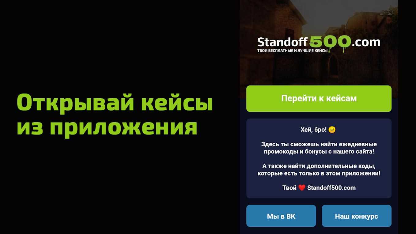 Standoff500.com – это удобное современное приложение, в котором вы найдете всю необходимую информацию об актуальных бонусных программах и промокодах на одноименном сайте. Каждый день здесь выкладываются новые коды на баланс, открытие кейсов, пополнение и прочие полезные вещи для использования на этом сайте. Получайте еще больше классных подарков и наслаждайтесь проектом.