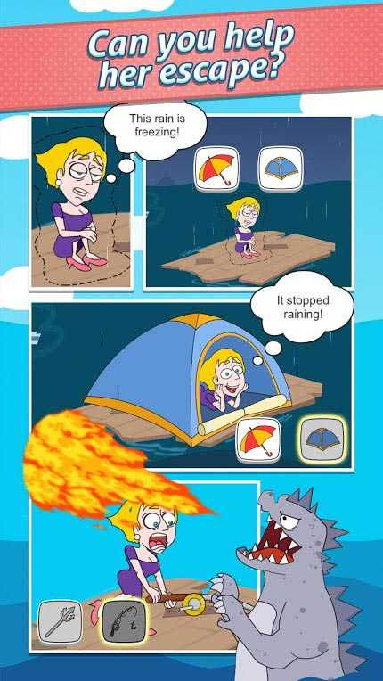 Save the Girl! – это забавные мультяшные приключения в жанре головоломки, где вам предстоит спасать девушку, оказавшуюся в беде. Попробуйте разгадать все загадки и победить множество злодеев, которые хотят навредить ни в чем не повинной милой даме. Каждый уровень включает множество интересных задач, для решения которых нужно подключить весь свой интеллект и смекалку. Вам предложат выбрать из нескольких вариантов, верный выбор приблизит девушку к спасению, а остальные варианты причинят ей неудобства, порой весьма смешные.