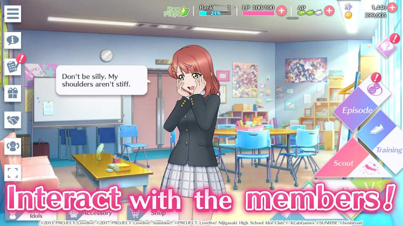 Love Live! All Stars – это очаровательная ролевая игра, в которой вы в образе ученика средней школы из токийского района начнете свой путь к славе. Вместе со школьными кумирами выступайте на ярком фестивале, путешествуйте с группой, открывайте новые истории, примеряйте эксклюзивные костюмы, записывайте классные клипы и просто веселитесь. Вас ждут ошеломительные шоу с шикарными песнями и спецэффектами, которые подарят массу положительных эмоций и надолго запомнятся.Информация об игре