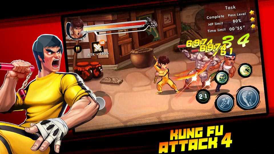 Kung Fu Attack 4 – это яркий динамичный экшен, в котором вы станете настоящим мастером кунг-фу. Истинным героям здесь предстоит сражаться с легендами теней. Выбирайте из нескольких доступных боевых искусств и оттачивайте навыки персонажа в пылких битвах с многочисленными соперниками. Улучшайте здоровье героя, его защиту, силу удара, технику владения тем или иным оружием, и тогда вы сможете победить даже самых сильных врагов. Отличная графика, инновационный геймплей, интенсивные баталии и многое-многое другое ожидает вас у этом удивительном мире боевых искусств.