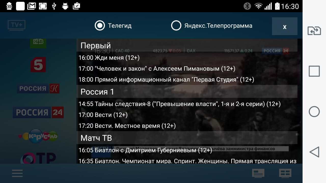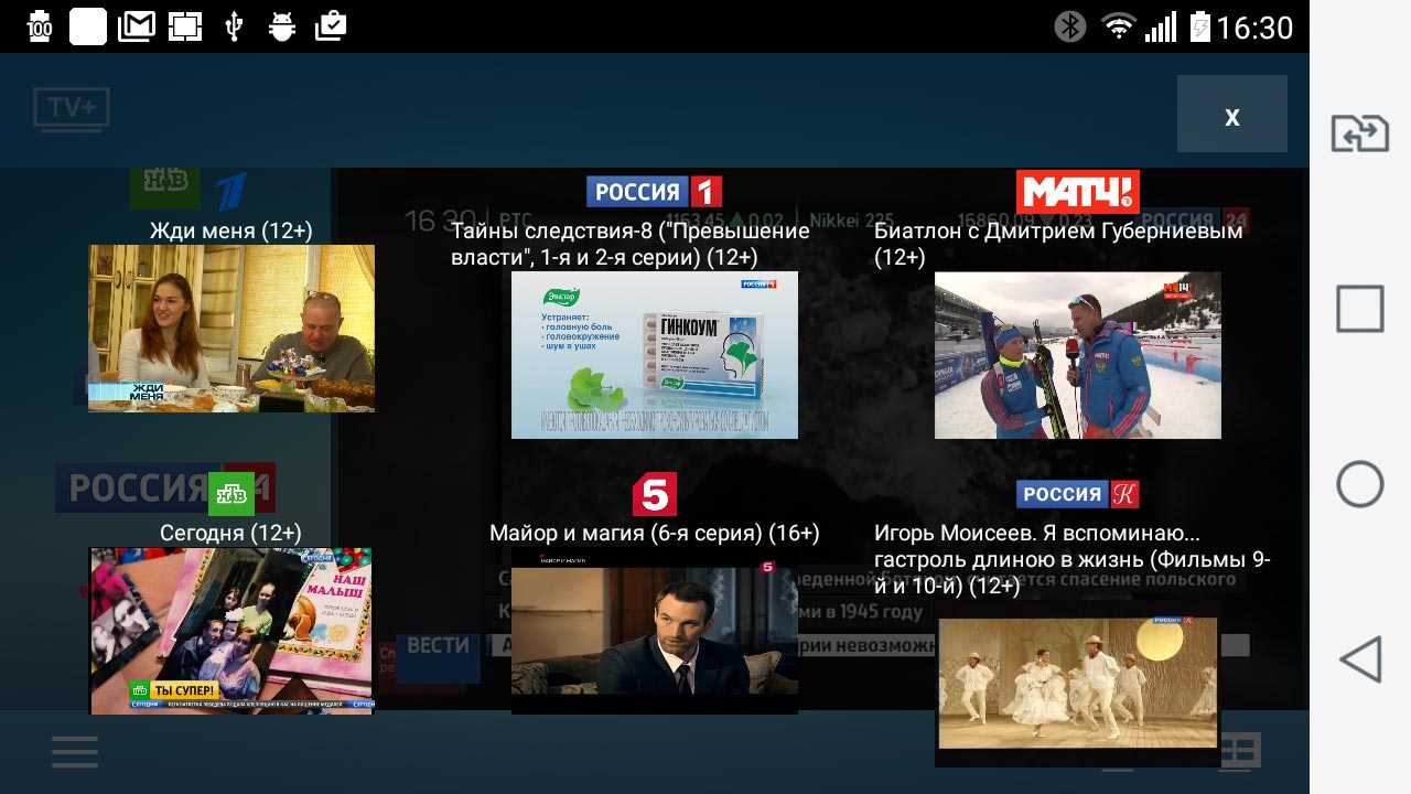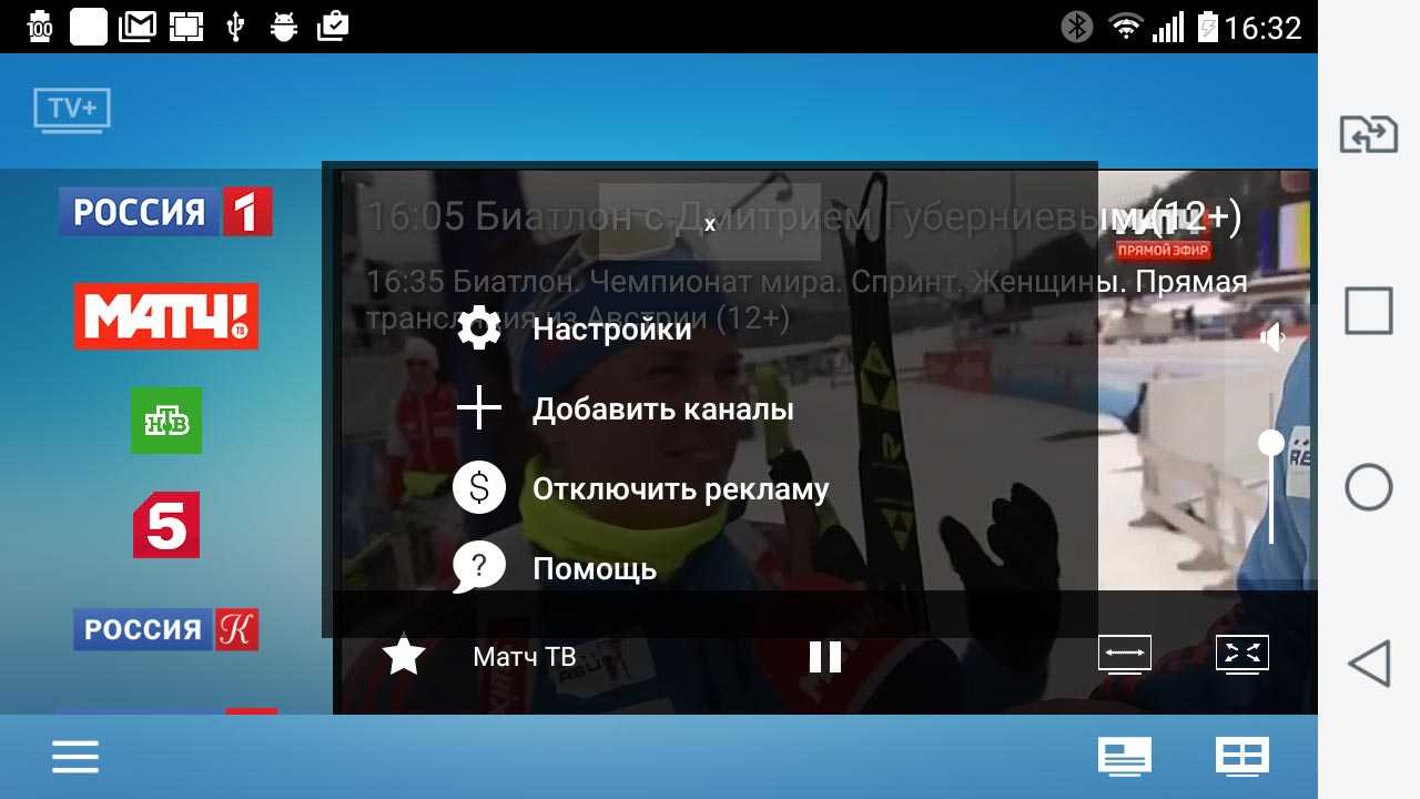 TV+ - это удобное мобильное приложение, открывающее доступ к основным российским и некоторым другим телеканалам. Платные и бесплатные каналы транслируются онлайн, вы можете смотреть все, что пожелаете. Стабильная работа программы доступна при наличии безлимитного интернета со скоростью соединения от 2 мегабит в секунду. Видео можно выводить поверх всех приложений.
