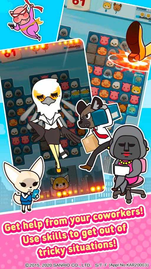 Aggretsuko – это занимательная мобильная головоломка, в которой вы займетесь оборудованием большого офисного здания. Стройте новые этажи, красьте помещения, собирайте документы и выполняйте другую работу, чтобы улучшить эффективность компании. В этом офисе никто не хочет работать, и главной вашей задачей будет сделать как раз наоборот, превратив его в уютное место для сотрудников.