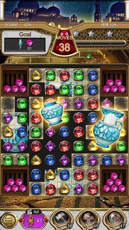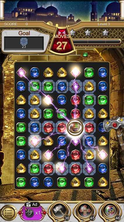 Драгоценности волшебная лампа – это классическая мобильная головоломка с сочной графикой и великолепными спецэффектами. Тут больше тысячи уровней ждут всех любителей занять себя интересными задачками, расслабиться за веселыми испытаниями и просто хорошо отдохнуть. Наслаждайтесь приятным оформлением проекта, простой механикой и отличной тренировкой для мозга. Собирайте как можно больше одинаковых драгоценностей, завершайте уровень и переходите на другой. Составляйте свою стратегию, пользуйтесь усилителями и становитесь настоящим мастером мобильных головоломок.