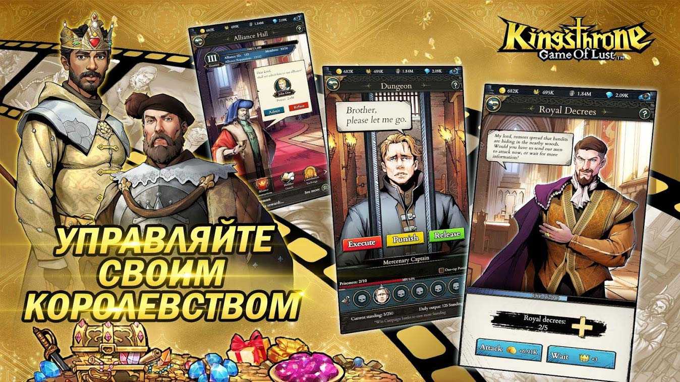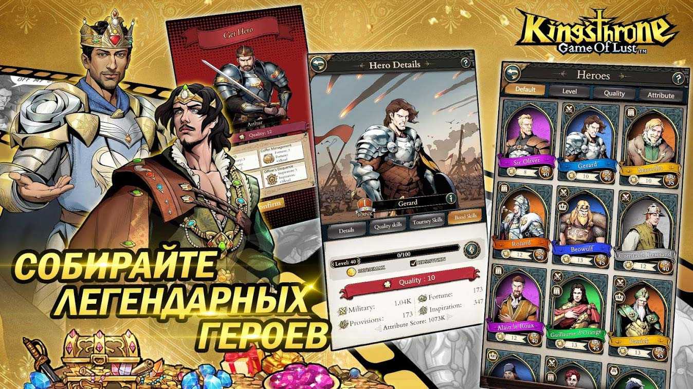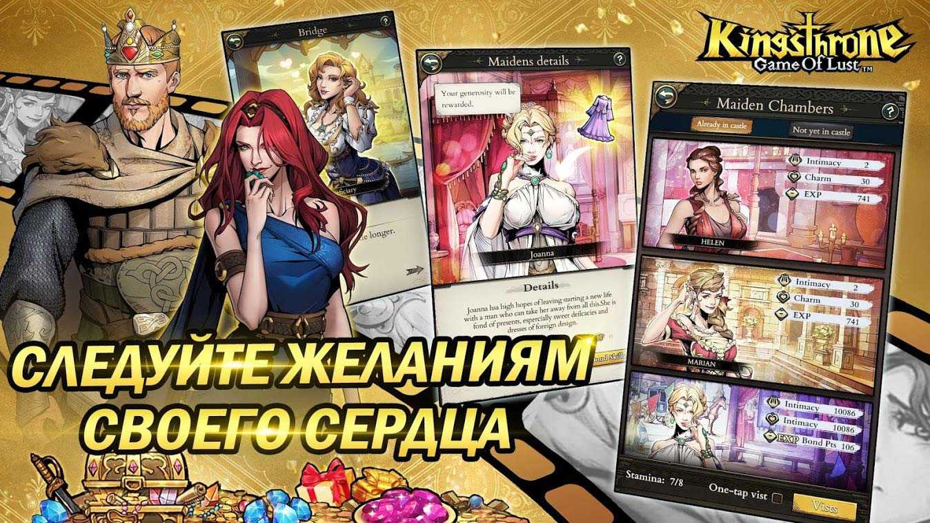 King's Throne: Game of Lust – это эпичная ролевая игра, в которой вам предстоит собирать легендарных героев, следовать желаниям своего сердца и основать новую великую династию. Займитесь управлением королевством, искупайтесь в роскоши дворцовой жизни и проникнитесь атмосферой средневековья. Не забывайте и про романтические отношения при дворе – эти интриги и страсть всегда манили множество людей. Объединяйтесь с другими лордами за круглым столом и вместе отправляйтесь в поход за великими победами.