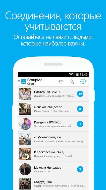 GroupMe – это отличное приложение для связи с близкими людьми. Добавляйте новых пользователей через номер телефона или электронную почту, и даже если у них это первое посещение данной социальной платформы, они быстро смогут влиться в общение и писать вам. Управляйте уведомлениями как вам угодно, чтобы всегда быть в курсе важной для вас информации и отсеивать другую. Создавайте отдельные группы и объединяйте в них значимых для вас людей, чтобы сделать их еще ближе и всегда быть на связи.