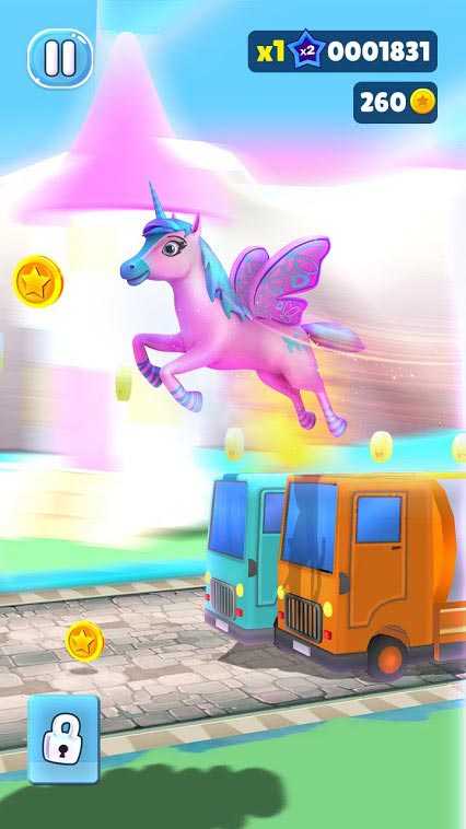 Бегущий единорог – это милый мобильный раннер, в котором вас ждут увлекательные приключения маленького Пони. Окунитесь в удивительный волшебный мир, полный радости и веселья. Бегите вперед, собирая ценные монетки и перепрыгивая через разные препятствия. Уворачивайтесь от ловушек и движущихся на большой скорости поездов, проходите все новые уровни и открывайте дополнительные игровые возможности. Красочная трехмерная графика, динамичный игровой процесс и прелестные единороги ждут всех любителей отличных мобильных развлечений и уютной атмосферы.