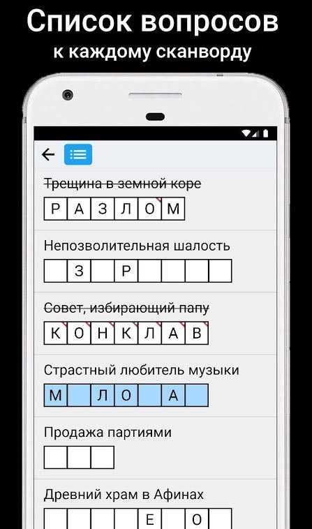 Сканворды на русском – это увлекательная словесная игра, с которой вы точно не соскучитесь. Здесь к каждому сканворду имеется список вопросов, а самих вопросов собрано более 9 тысяч. При возникновении сложностей с разгадыванием вы всегда можете воспользоваться бесплатными подсказками, чтобы долго не задерживаться на одном задании. Простой и удобный интерфейс, ночной режим, приятная затягивающая атмосфера, хорошая тренировка для мозга и расширение словарного запаса – с таким мобильным приложением вы не только отлично отдохнете и расслабитесь, но и станете умнее, что полезно в любой ситуации.