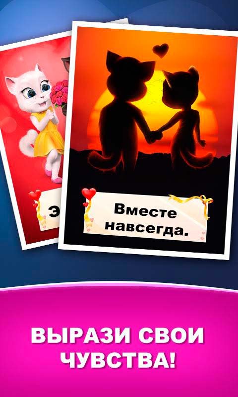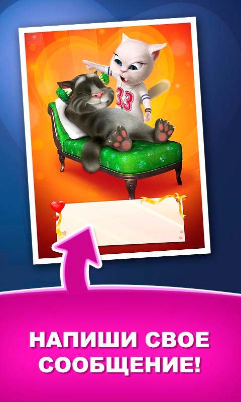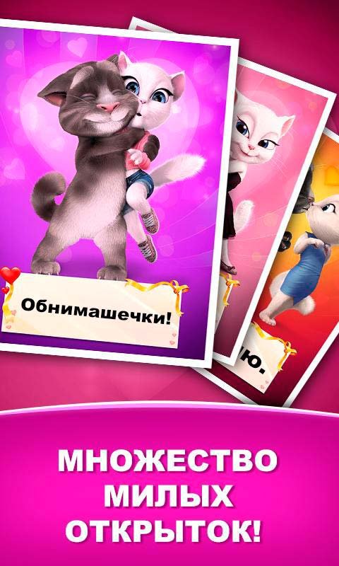 Вместе с этой игрой о говорящих питомцах сможете получить большое разнообразие замечательных любовных открыток и поделиться ими со своими любимыми. Сегодня у говорящих Анджелы и Тома есть огромное количество разнообразных идей и открыток, способных рассказать о чувствах. Кроме всего этого здесь есть несколько оригинальных музыкальных композиций, которые подарят вам удовольствие и вашей второй половинке. Теперь вы сможете отправить своим возлюбленным открытки и стихотворения. Это уникальные возможности, благодаря которым Анджела и Том помогут вам в абсолютно любых начинаниях. Делитесь любовью со своими близкими с помощью этих оригинальных возможностей.Информация об игре