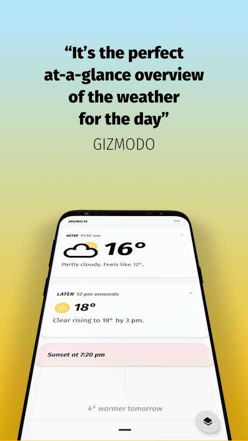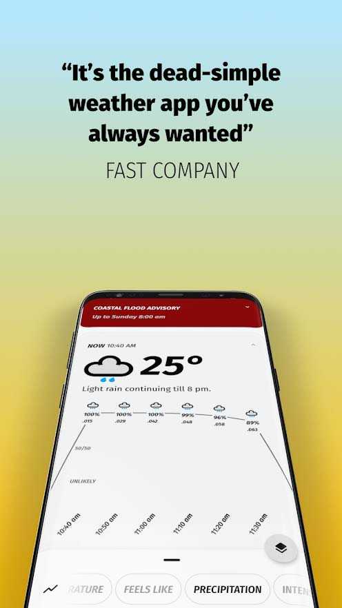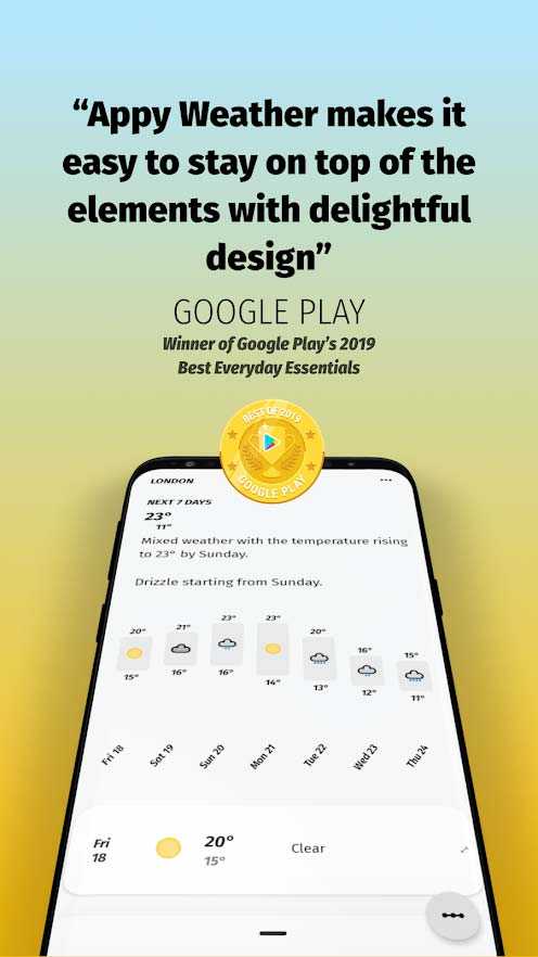 Appy Weather – это одно из лучших погодных приложений по мнению многих пользователей. Здесь собрана лишь самая нужная и важная информация, приведенная на экране в формате пары строк, что очень удобно. Проверяйте погоду быстро и легко в любое время. Можно посмотреть прогноз по часам и суткам. Оценивайте климатическую обстановку на основе достоверных данных и будьте всегда одеты по погоде.