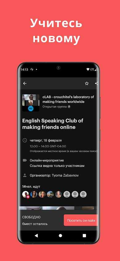 Meetup – это простой и удобный поиск групп и мероприятий, с которым вы по-другому взглянете на свой город. Встречайтесь онлайн или договаривайтесь о встрече вживую, знакомьтесь с новыми людьми и побывайте в новых местах, что находятся совсем недалеко от вас. Следите за интересными мероприятиями, создавайте собственные группы и увлекательно проводите время в приятной кампании.