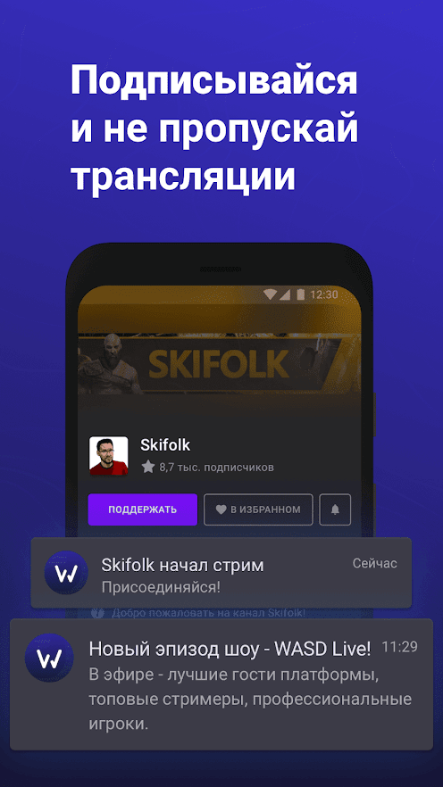 WASD.TV – это приложение для просмотра стримов на мобильном телефоне. Смотрите любимые трансляции и записи игр, подписывайтесь и не пропускайте самое интересное. Сохраняйте яркие моменты и делитесь ими с друзьями. Общайтесь с другими зрителями и стримерами в удобном чате. Наслаждайтесь классными трансляциями в высоком качестве когда вам захочется и всегда будьте в курсе актуальной информации в мире киберспорта.