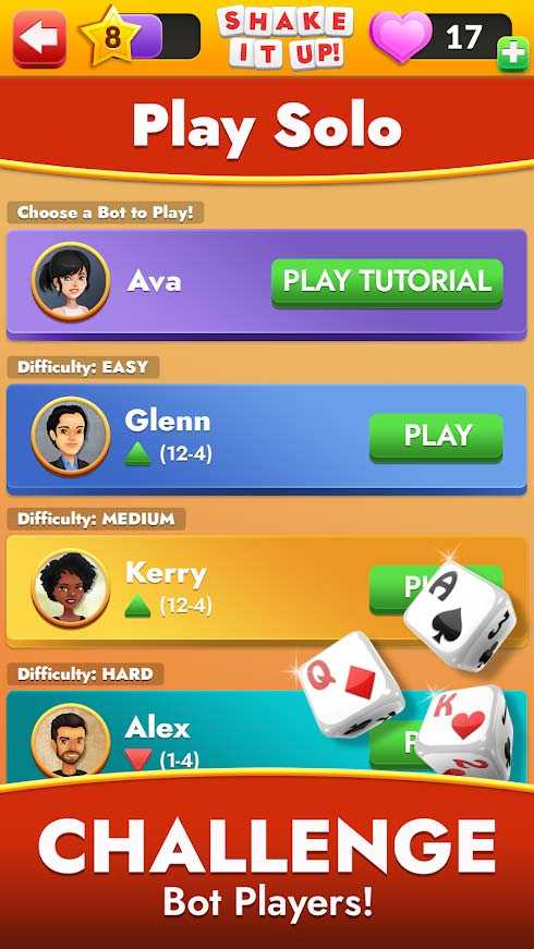 SHAKE IT UP! Dice – это увлекательная игра в кости на экране вашего мобильного телефона. В управлении тут разобраться очень легко, механика понятна с первых же минут, а приятное визуальное оформление радует глаз. На костях вместо привычных цифр нарисованы значения игральных карт – собирайте лучшие комбинации и побеждайте соперников. Соревноваться можно как с компьютером, так и с реальными людьми.
