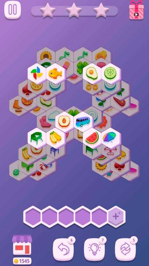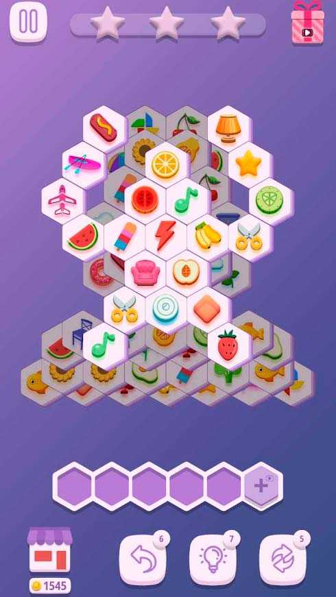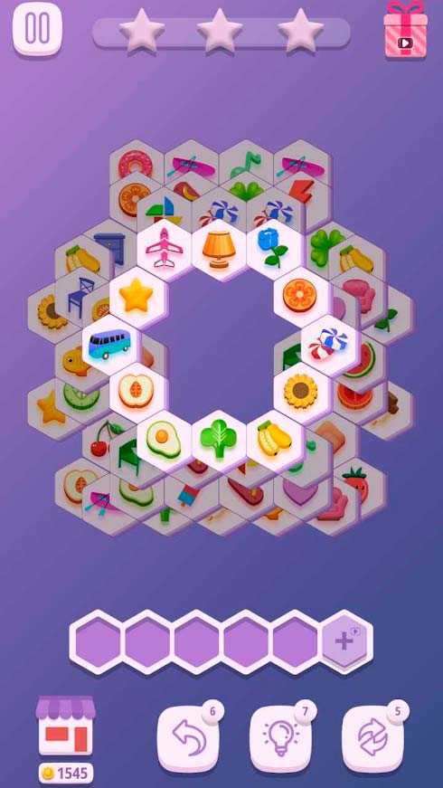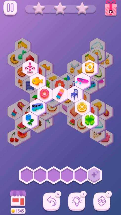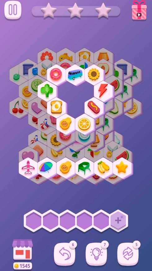 Подбери шестиугольники – это очаровательная головоломка с простой механикой и затягивающим геймплеем. В каждом раунде тут вы увидите кучу карточек с картинками на игровом поле. Чтобы пройти уровень, нужно находить карточки с одинаковыми изображениями и убирать их на специальную линию в верхней части экрана, где они сжигаются. Ищите нужные картинки и расчищайте поле, отдыхая за неспешной игрой в приятном оформлении.