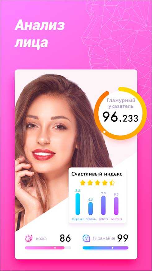 Fantastic face – это удивительное мобильное приложение, позволяющее открыть множество секретов с помощью вашего лица. Оцените состояние здоровья, узнайте о любовных изменениях, улучшайте благосостояние и развивайте карьеру с помощью небольшой программы на телефоне. Она быстро просканирует ваше лицо и выдаст полноценный анализ, основанный на персональных данных. Проходите интересные тесты и открывайте себя с новой стороны. Кроме лица тут можно немало узнать и с помощью хиромантии – ваша ладонь также готова многое рассказать не только о настоящем или прошлом, но и о будущем.Информация об игре