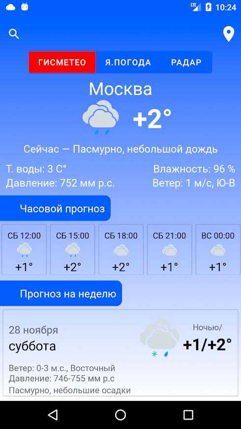 Прогноз погоды – это обычное мобильное приложение, которое довольно точно показывает погоду у вас за окном как в настоящий момент, так и прогнозом на неделю. Оно основывается на нескольких источниках и выдает проверенные данные, так что ему можно доверять. Удобный интерфейс и лишь самые необходимые инструменты не нагружают оперативную память и не дают запутаться в данных.