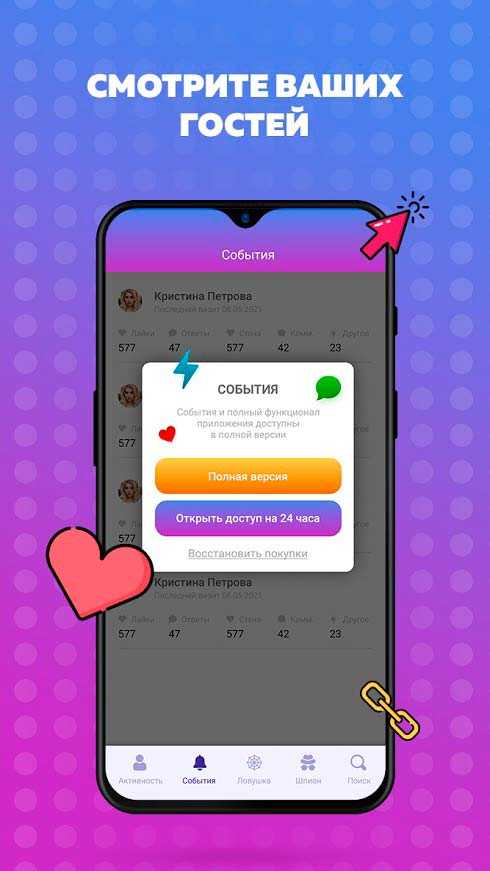 Гости ВК – это мобильное приложение для работы с ВК, позволяющее отслеживать посещение вашей страницы. Так вы легко узнаете о посетителях профиля и их действиях в нем. Можно настраивать уведомления об удалившихся из подписчиков друзьях, увидеть ваших «поклонников», посмотреть количество входящих и исходящих лайков, изучить комментарии и проанализировать другую статистику страницы ВК.