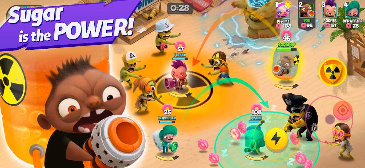 Kids VS Zombies – это крутые мобильные баталии, в которых вашей основной целью станут пончики. С таким эпичным экшеном никто не заскучает, ведь тут собрано столько всего интересного. Хватайте пушку помощнее и отправляйтесь на арену воевать с другими игроками или героями от компьютера. Забавные боевые детишки покажут любому как нужно правильно сражаться с зомби, и самый лучший игрок получит больше всех вкуснейших пончиков.