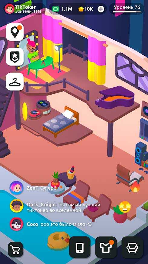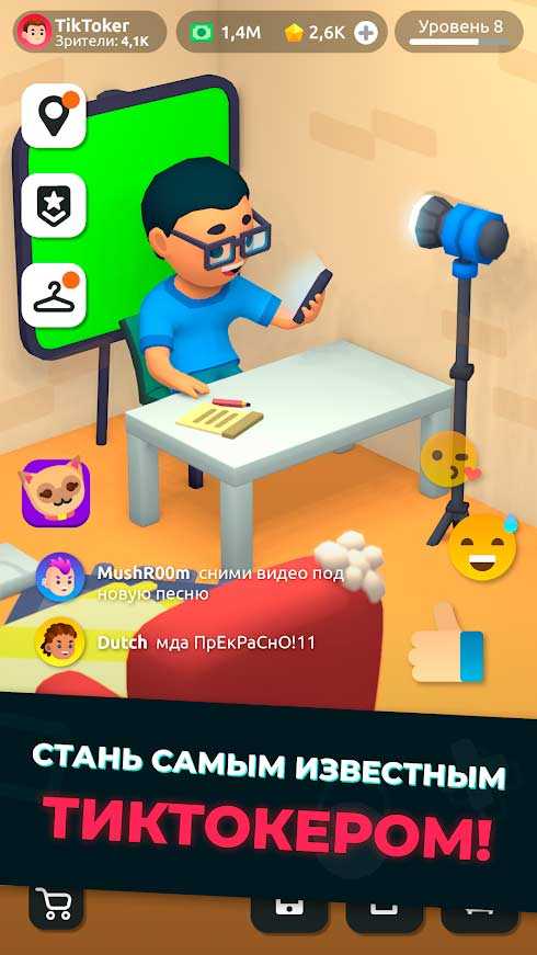 Idle Tiktoker – это крутой мобильный симулятор тиктокера, в котором вы сможете стать настоящей звездой. Разбогатейте на своей популярности, записывая видео и показывая их всему миру. Развивайте канал, набирайте подписчиков и становитесь все известнее. Лишь самые яркие и запоминающиеся личности смогут пробраться в топ тиктокеров и занять там верхние места – постарайтесь стать одним из них.Информация об игре