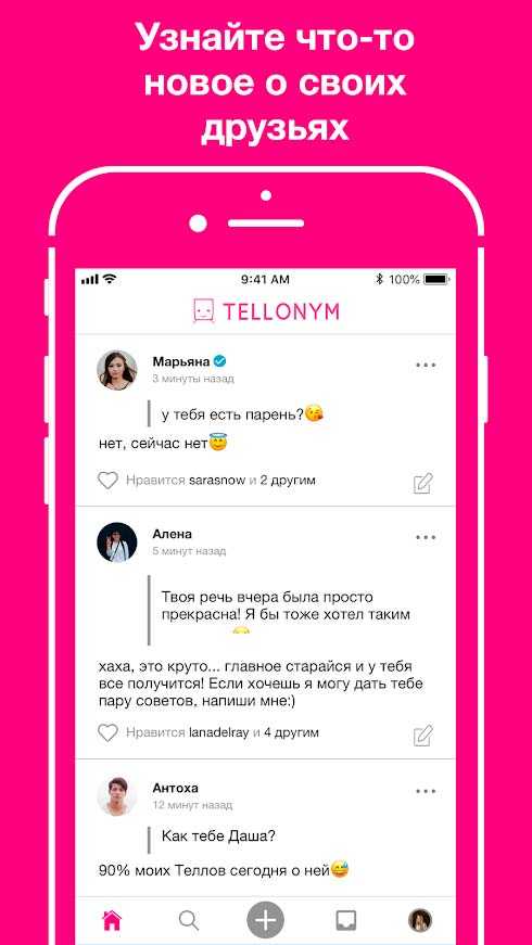 Tellonym – это уникальное приложение для обмена честными сообщениями. Здесь вас ждут анонимные беседы, в которых всегда можно найти интересных людей и просто почувствовать близость с собеседником. Выбирайте вопросы, отвечайте на них и делитесь ответами в сети. Тут можно узнать много интересного о друзьях и знакомых, так что приготовьтесь к удивлению или еще каким неожиданным эмоциям.