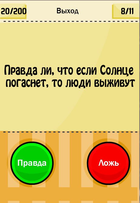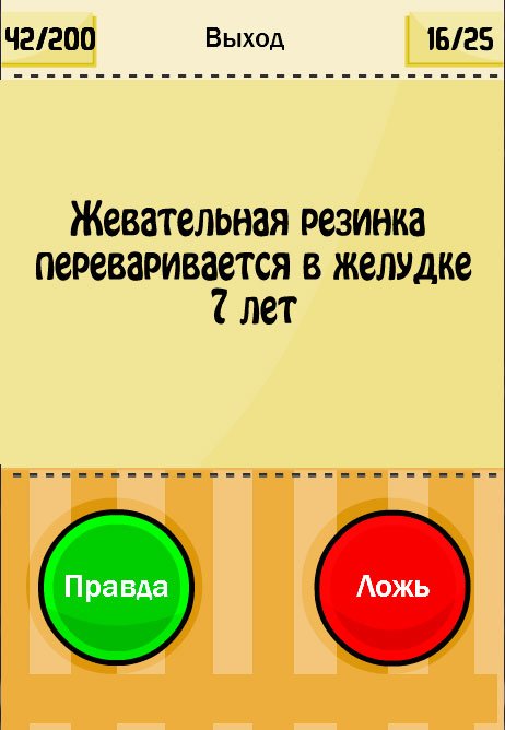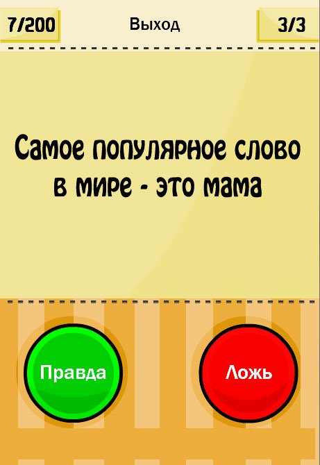 Вопросы, вошедшие в коллекцию этой викторины, подойдут как для детской публики, так и для взрослых. Именно поэтому миллионы игроков уже решили скачать Правда или Ложь - Новая версия на андроид и наслаждаются прохождением тестов. Более того, главная интрига будет заключаться в вопросе под номером 25. Игроку будет очень хотеться поскорее дойти до него, а в подарок он получит очень занимательный факт, который сможет удивить и даже поразить воображение. Если вы занимаетесь изучением английского, тогда переключитесь на вопросы на этом языке. Это поможет получше узнать о языке.