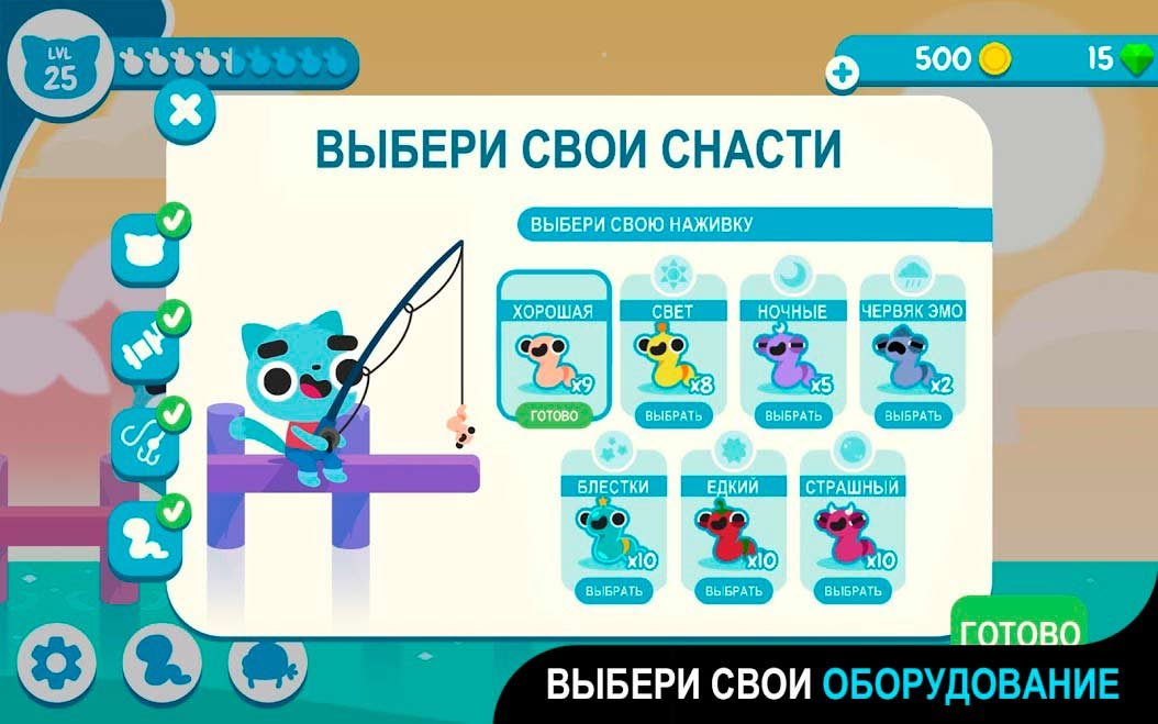 Нет ничего сложного, чтобы начать игровой процесс и игрок очень быстро освоиться с управлением. Просто нужно насаживать на крючок снасти в виде червяка или другой наживки, а дальше закинуть в озеро и ждать, пока рыбка начнет клевать, чтобы ее тут же подсечь и вытащить. Такой интересный процесс игры позволит игрокам бесконечно наслаждаться ритмами действий и ловить все больше рыбки для этих забавных котиков. Главное преждевременно подготовить все, что нужно будет для того, чтобы ловить рыбку, и вы должны позаботиться об этом. Наслаждайтесь и спокойно проходите уровень за уровнем.Информация об игре