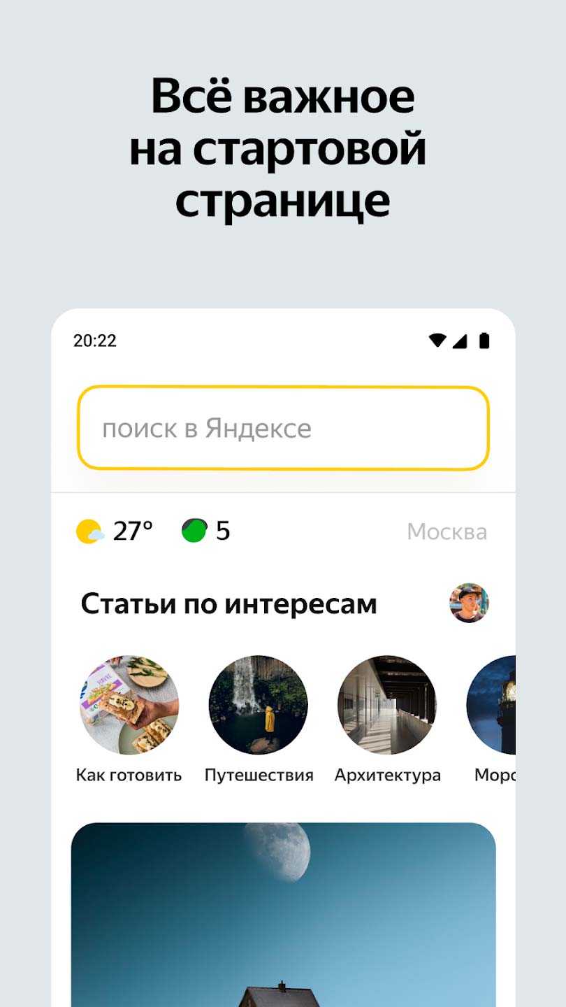 Яндекс Старт– это популярнейший браузер в удобном приложении на вашем мобильном гаджете. Получайте быстрый доступ к желанной информации в сети, не пропускайте ни одной свежей новости, заказывайте билеты и делайте покупки онлайн, будьте всегда готовы к любым изменениям погоды с этой незаменимой программой. Перед вами открывается огромное множество функций, которыми каждый день успешно пользуются миллионы пользователей во всем мире.