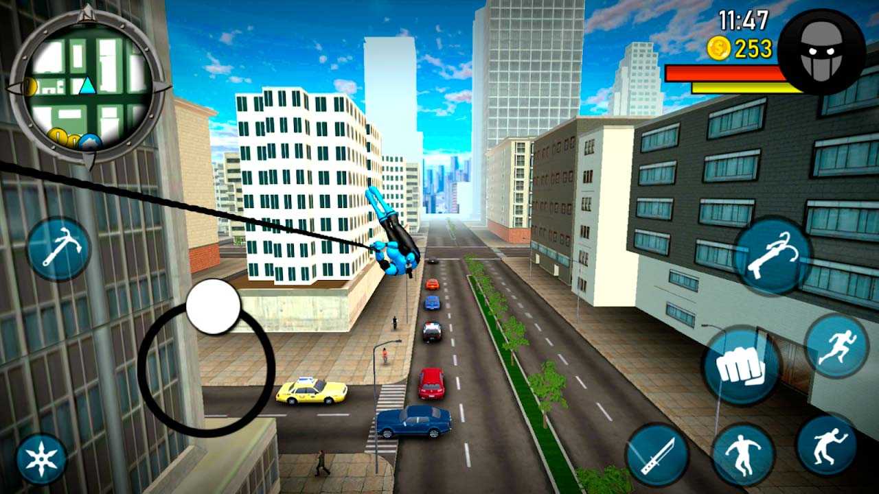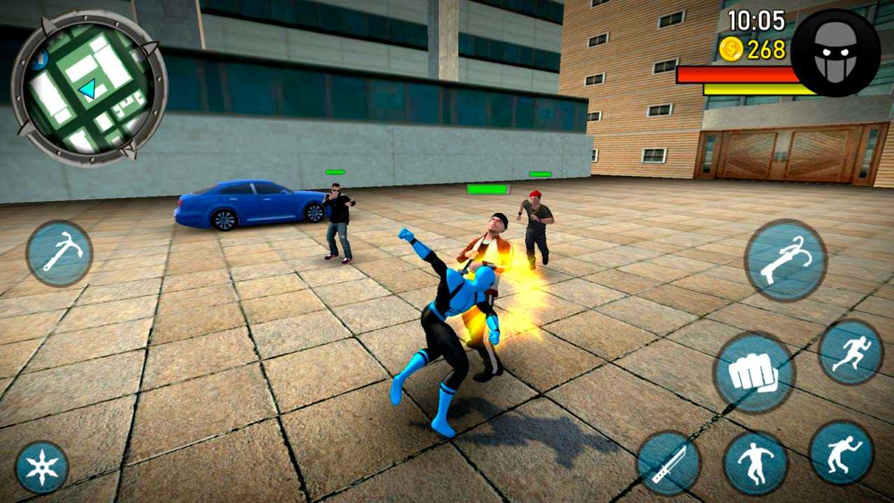 Blue Ninja – это крутой экшен с супергероями и динамичными битвами. Сражайтесь на территории просторного открытого мира и побеждайте преступность, чтобы навести порядок. Бегите в парк или на улицу, ищите бандитов и помогайте мирным жителям. В вашем распоряжении супергерой в синем костюме с кучей трюков. Его специальные приемы эффективны в разных ситуациях – комбинируйте атаки и вы сможете одолеть даже самых опасных злодеев. Высококлассная графика и динамичный геймплей подарят вам массу ярких впечатлений.