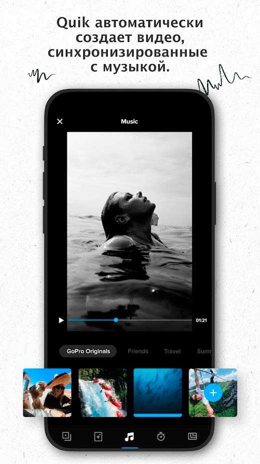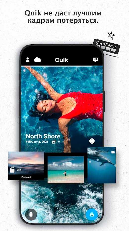 GoPro Quik – это новый редактор видео для мобильных платформ, в котором можно легко создавать крутые кинематографические ролики. Собирайте кадры вместе, сохраняйте лучшие из них в галерее и экспериментируйте с программой, осваивая разные ее опции. Инновационные технологии на основе искусственного интеллекта автоматически подбирают удачные кадры – вам остается лишь утвердить выбор. Удобное управление и широкий функционал порадуют любого пользователя.