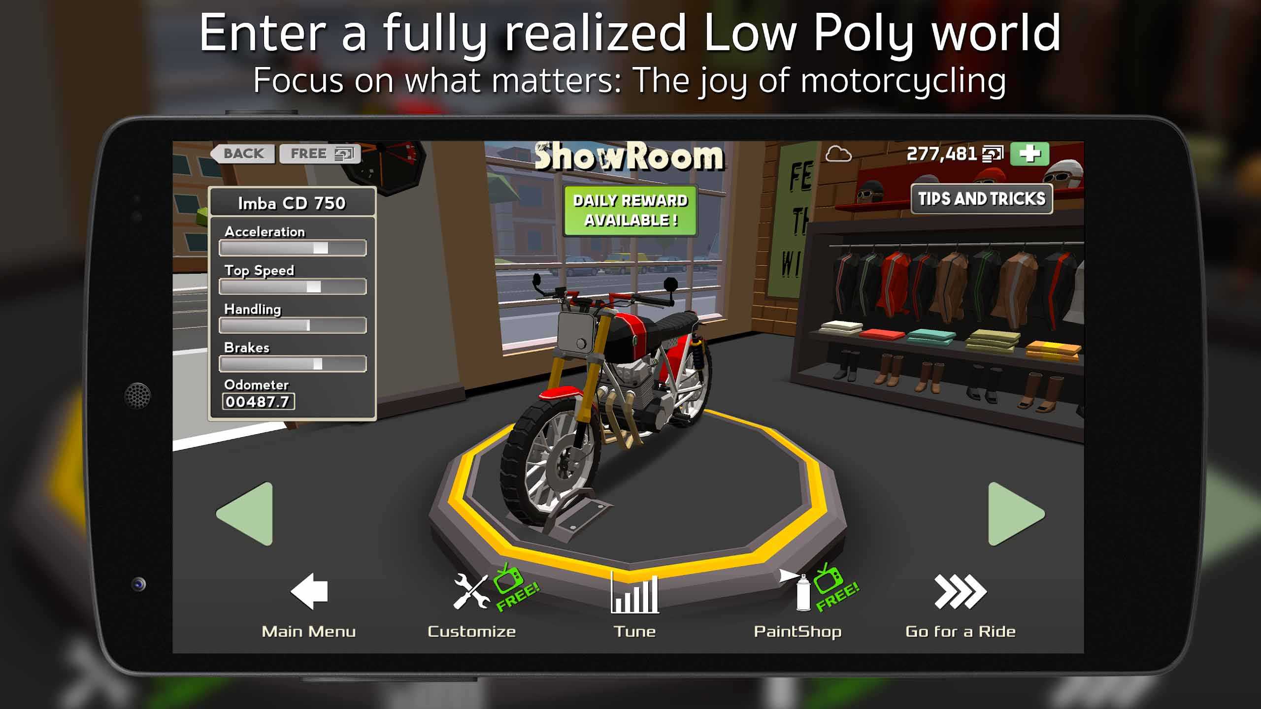 Cafe Racer – это забавные гонки на мотоциклах с незатейливой графикой и простым управлением. Тут нет временных ограничений и бесконечное топливо, так что скучать вам не придется. Виртуальный мир изображен в довольно упрощенной форме, поэтому вы легко сможете сосредоточиться. Множество видов байков на выбор и красочные локации подарят вам массу положительных эмоций.
