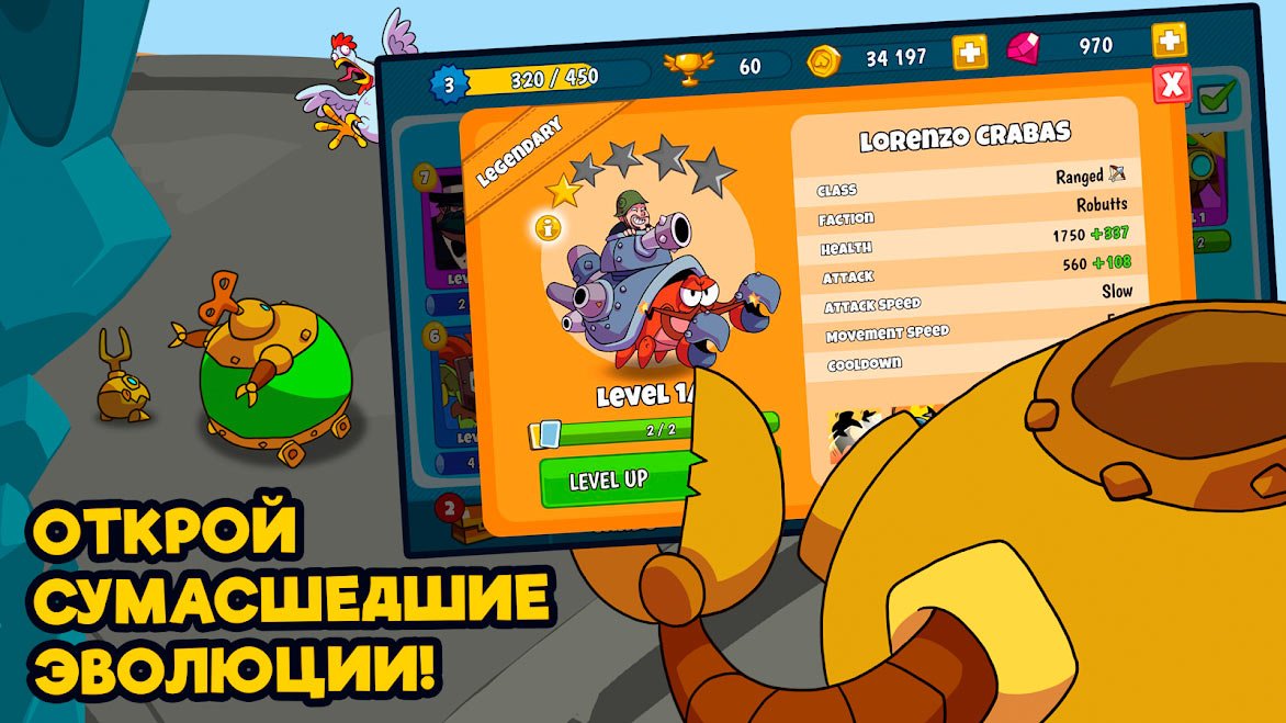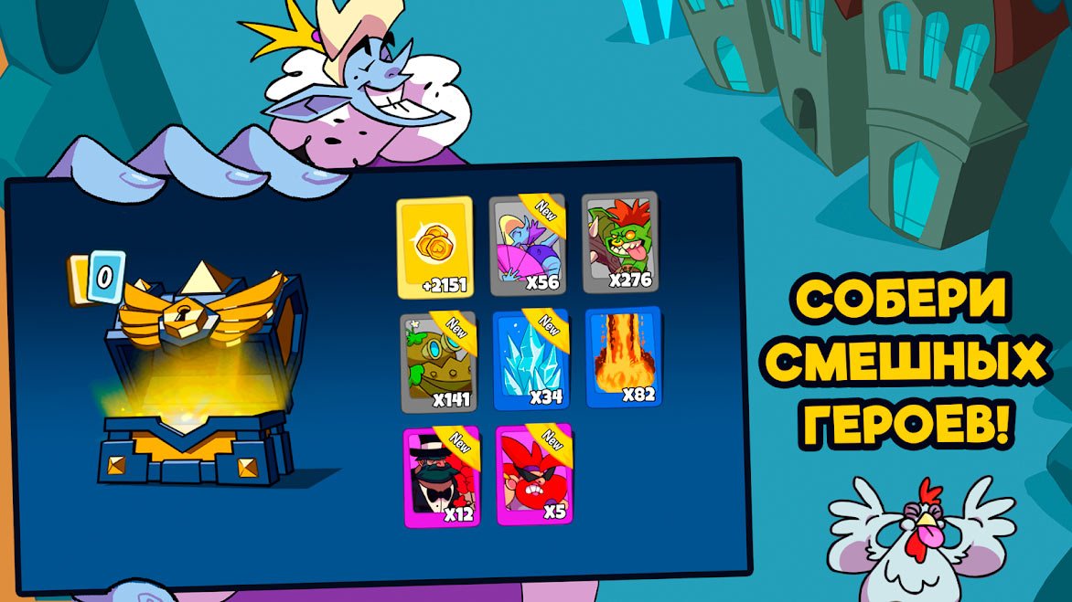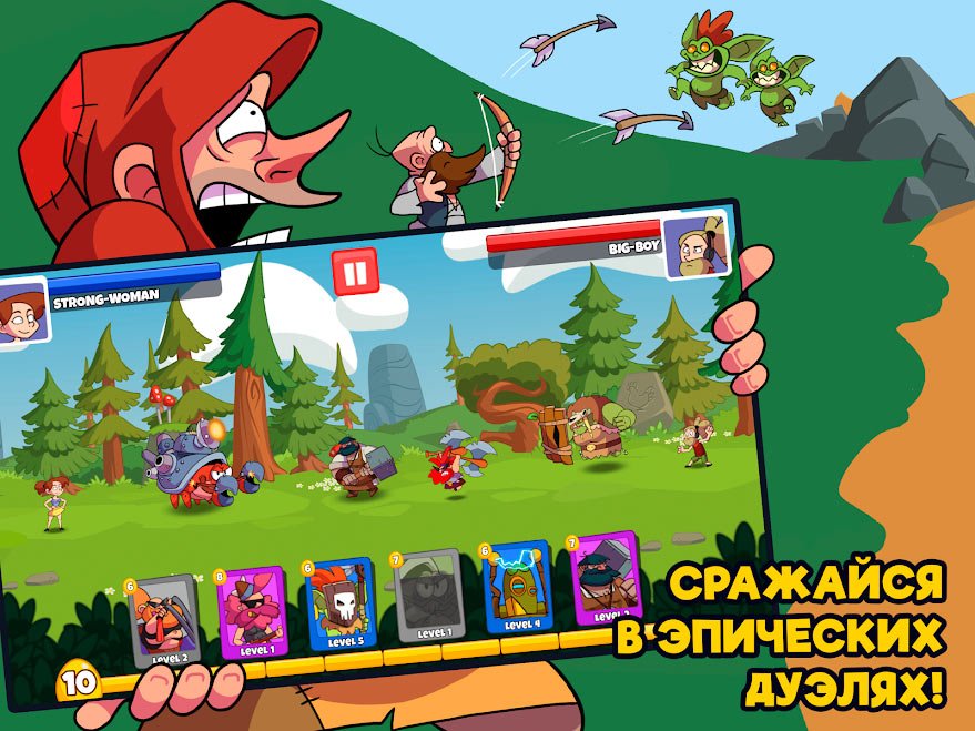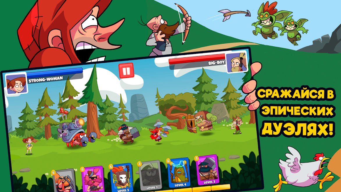 Приготовьтесь использовать в эпических битвах героев, обладающих индивидуальными характеристиками и вооружением. Вы должны попытаться всеми силами собрать собственную уникальную и мощную армию. Проводите фантастические атаки своих соперников и постоянно улучшайте уровень собственных героев, которые пополнят вашу колоду карт. Можно бесконечно наслаждаться такой замечательной красивой мультяшной графикой и не переставать удивляться