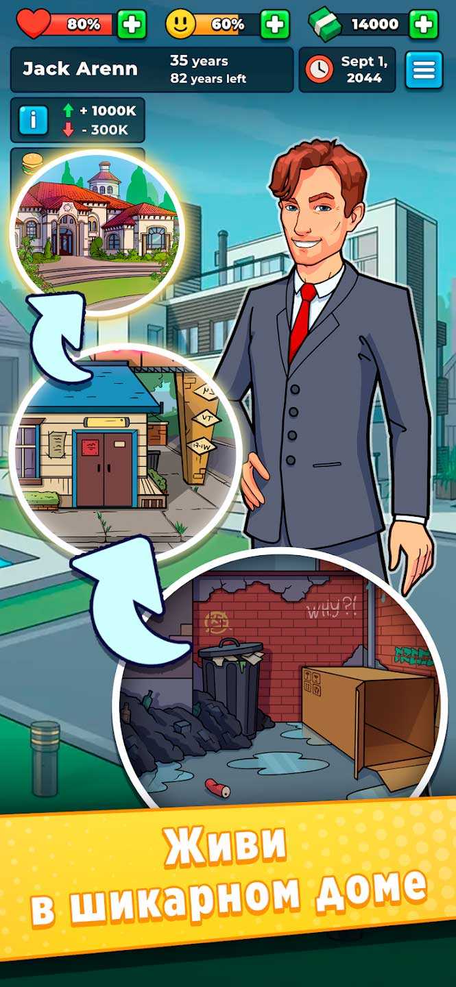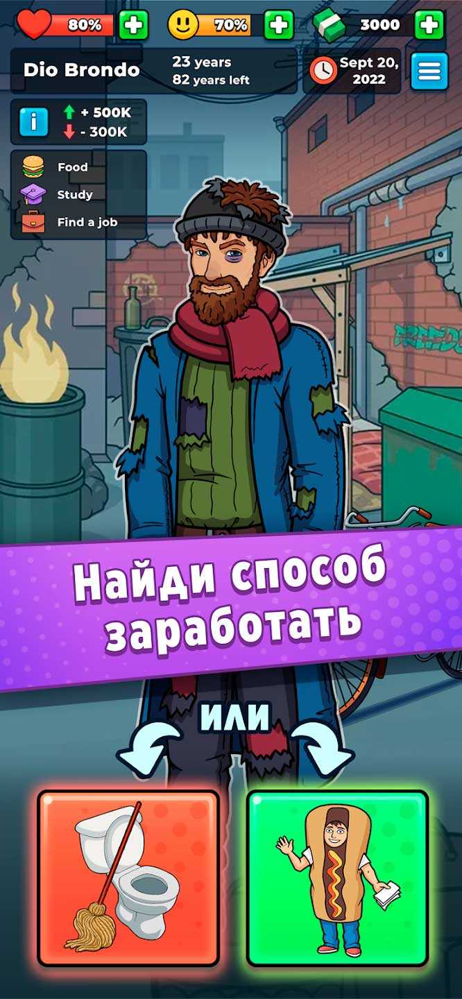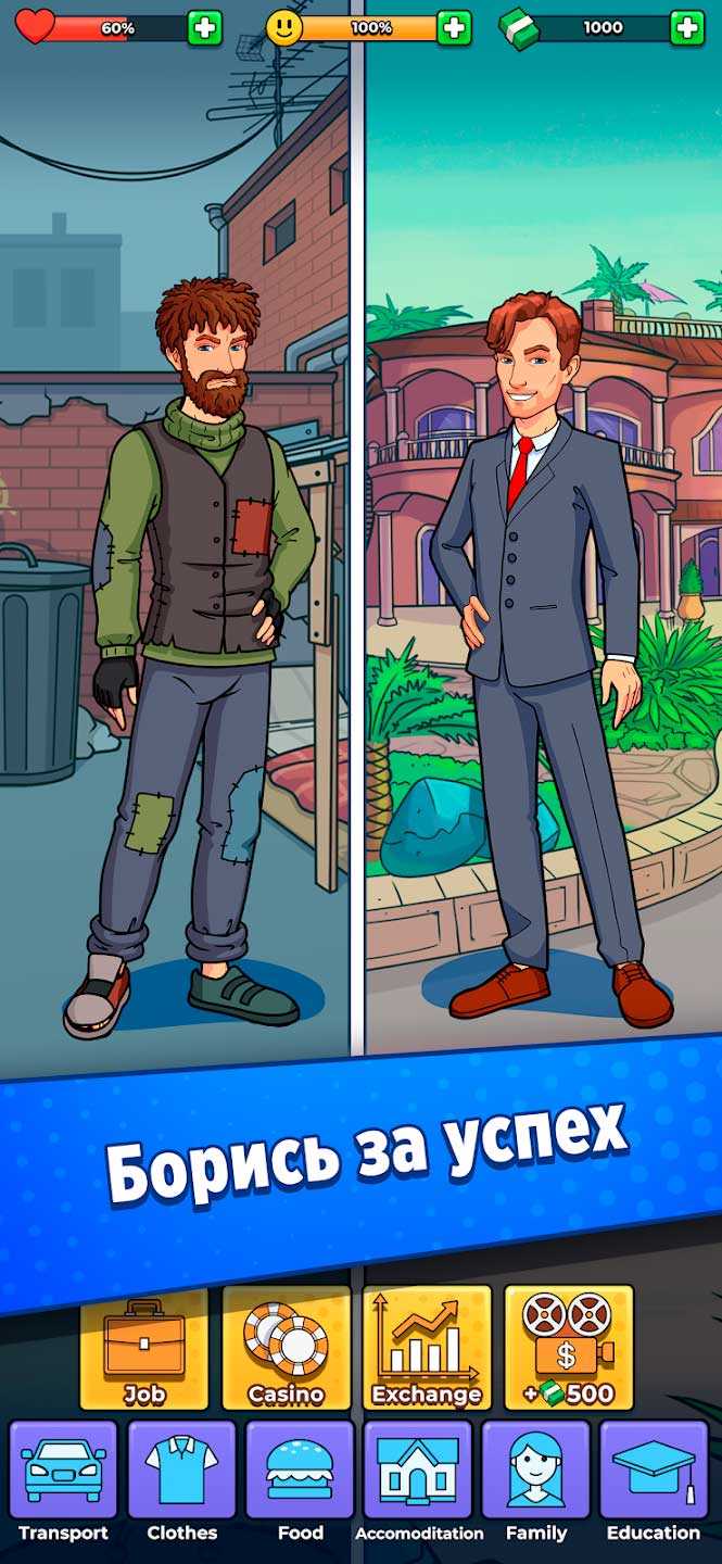 Жизнь Бомжа – это новый увлекательный симулятор построения карьеры, в котором каждый сможет подняться от ободранного бродяги до миллионера, управляющего бизнесом мирового уровня. Ваша судьба только в ваших руках, так что пора брать себя в руки и приниматься за серьезную работу. Симуляция виртуальной жизни начинается с самого дна, когда у вашего героя ничего нет, кроме мечты о лучшем будущем. Так что придется использовать все доступные возможности, чтобы поскорее подняться и стать человеком, построить собственный бизнес и воплотить все свои мечты в жизнь.