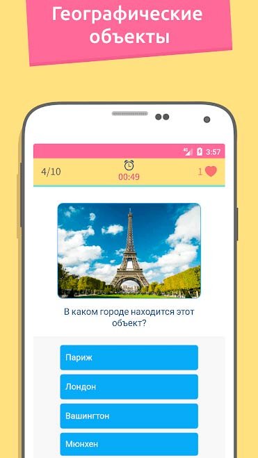 Как только в вашем мобильном устройстве появится этот интересный игровой процесс, вы сможете выбрать абсолютно любой режим игры, и все они доступны бесплатно. Ориентируйтесь по большому количеству головоломок и категорий, чтобы наслаждаться своей самой любимой в жизни тематикой. Вы сможете легко в ней ориентироваться и давать только верные ответы, получая между этим удовольствие от игры. Выбирайте на каждом вопросе один из четырех ответов, чтобы продвигаться дальше и стать лучшим в списке онлайн рейтинга. Каждый новый уровень сложно вам будет нравиться играть в такой викторине и особенно если пригласить своих друзей.