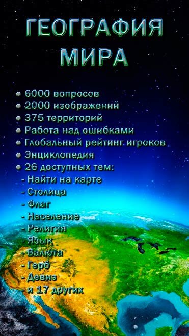 География Мира – это широкий современный сборник полезных для любого человека знаний по географии. Здесь вы сможете принять участие в увлекательной викторине, содержащей разнообразные вопросы характерной тематики. С таким приложением вы быстро поднимете свой уровень знаний о нашей планете, узнаете даже про самые небольшие государства и уникальные места. Столицы, флаги, население, национальная валюта – тут вы найдете полную информацию по многим географическим вопросам.
