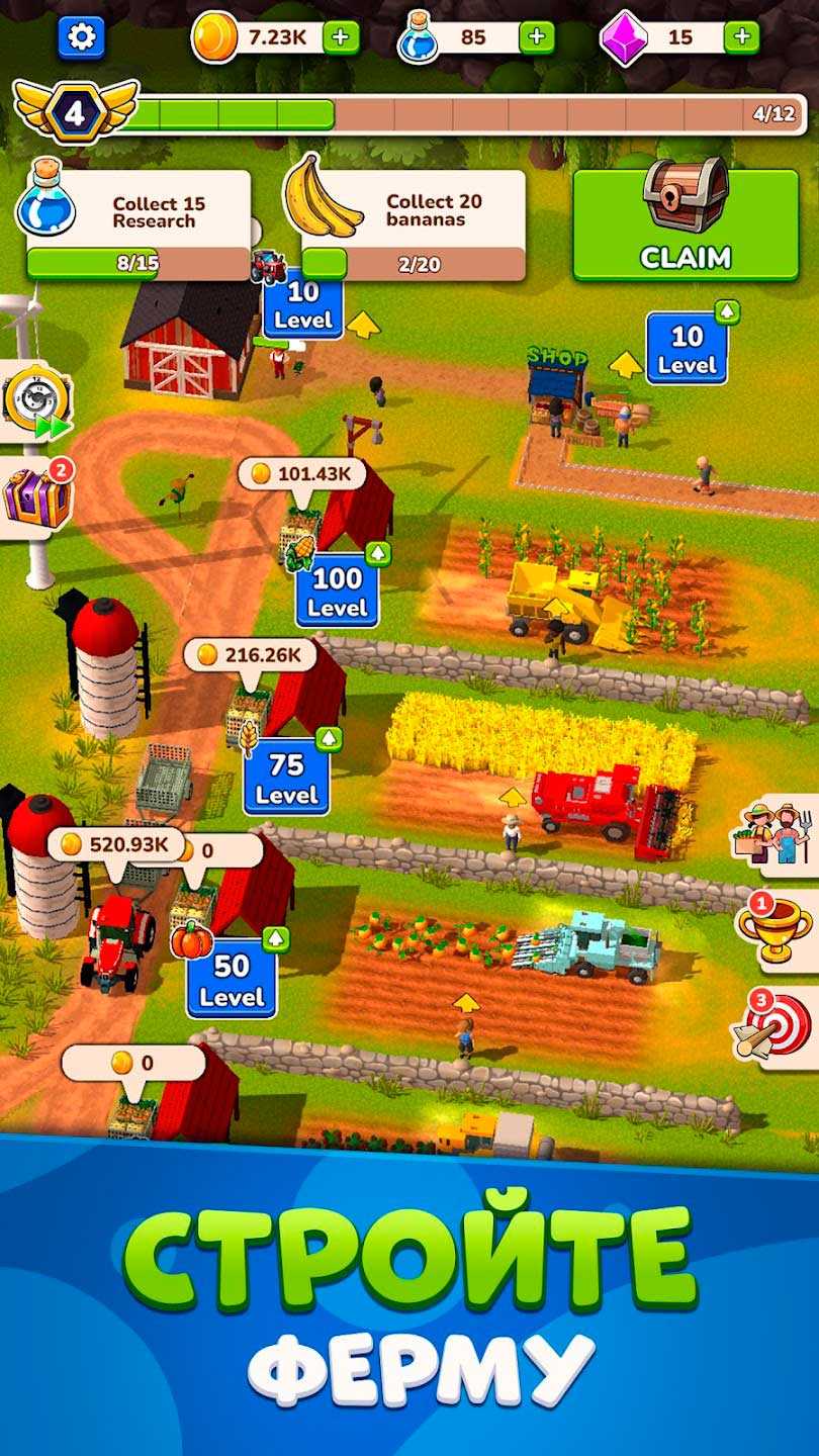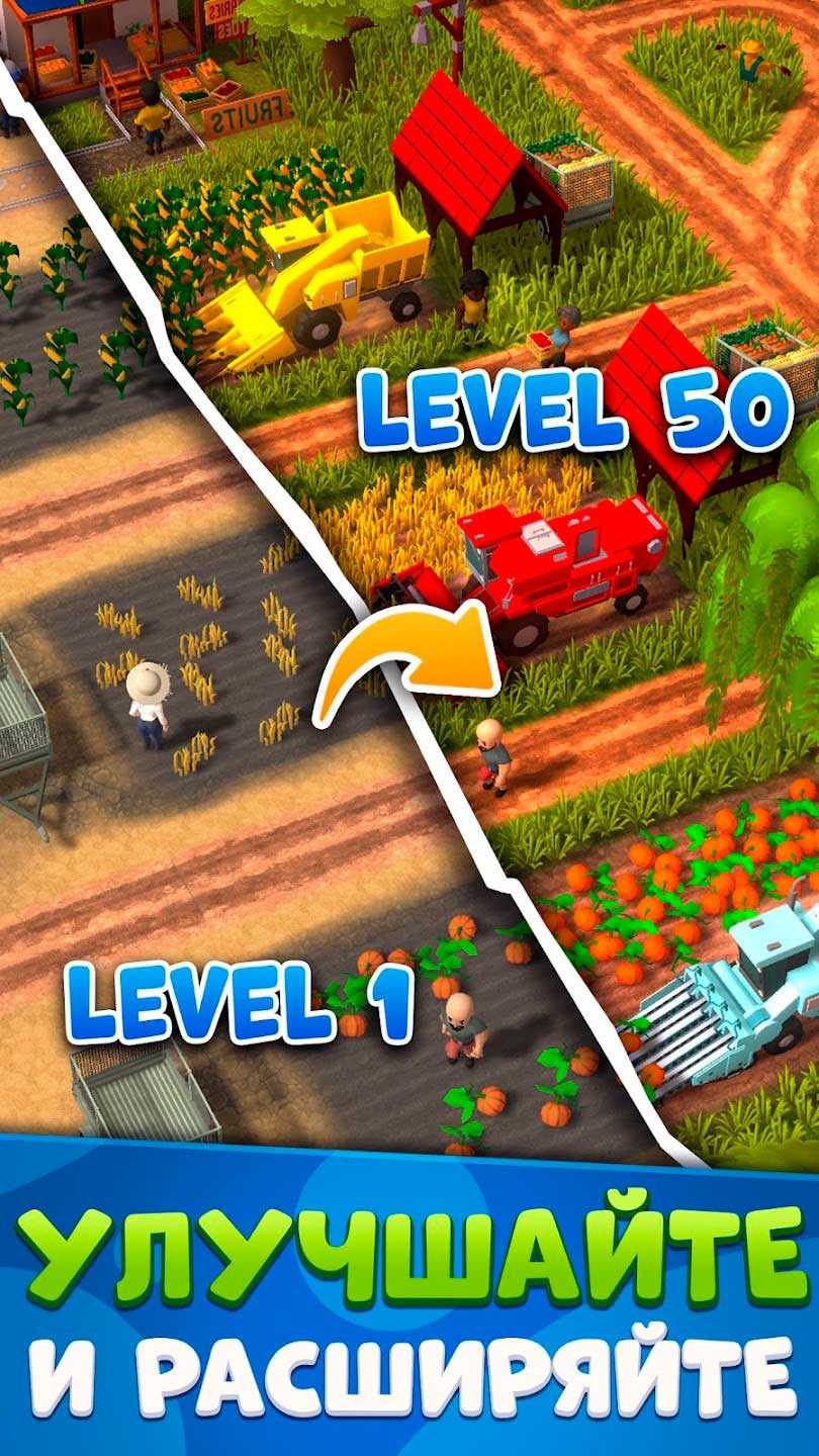 Idle Farm: Harvest Empire – это новая фермерская игра, где вас ждет империя сбора урожая. Возьмите в свои руки управление большой фермой и станьте магнатом сельского хозяйства. Засеивайте поля, ухаживайте за посевами, выращивайте больше и получайте отличные награды за свои старания. Развивайтесь потихоньку, нанимайте сотрудников, расширяйте штат менеджеров и упрощайте себе работу. Достойная графика, широкие игровые возможности и расслабляющая атмосфера делают это приложение одним из лучших в своем жанре. В нем вы всегда можете приятно отдохнуть и с интересом провести время.