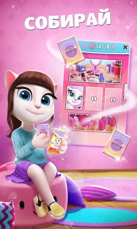 Сегодня уже миллионы детей подружились с Анжелой и каждый день радостно играют в это приложение. Одевайте ее в красочные наряды и сделайте из своего питомца настоящую модницу, которая будет щеголять по подиуму и удивлять всех своей небесной красотой. Создайте свой неповторимый стиль и покажите всем, как вы умеете работать с костюмами и макияжем. А если станет скучно, с такой кошкой всегда можно занимательно поболтать.