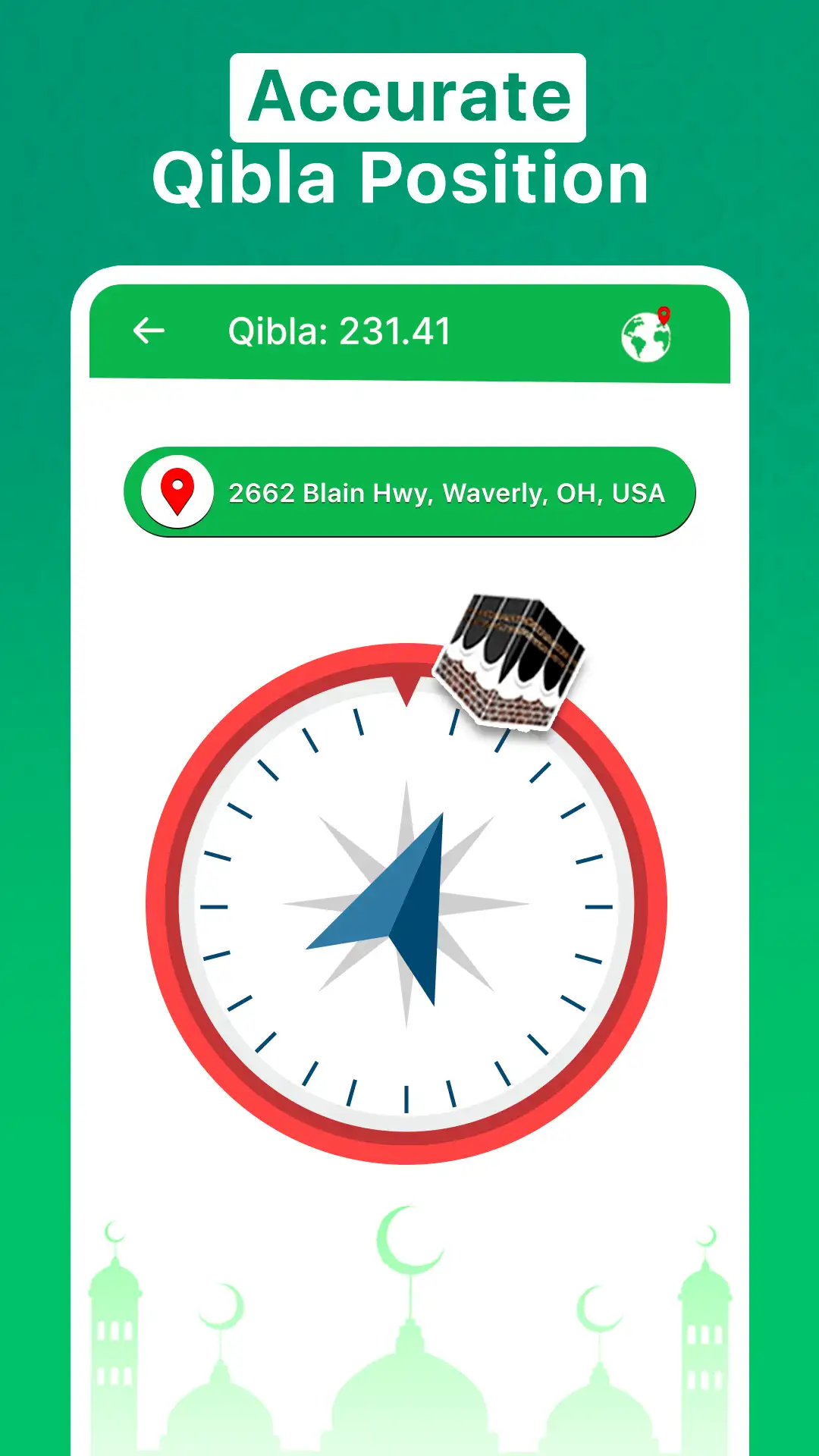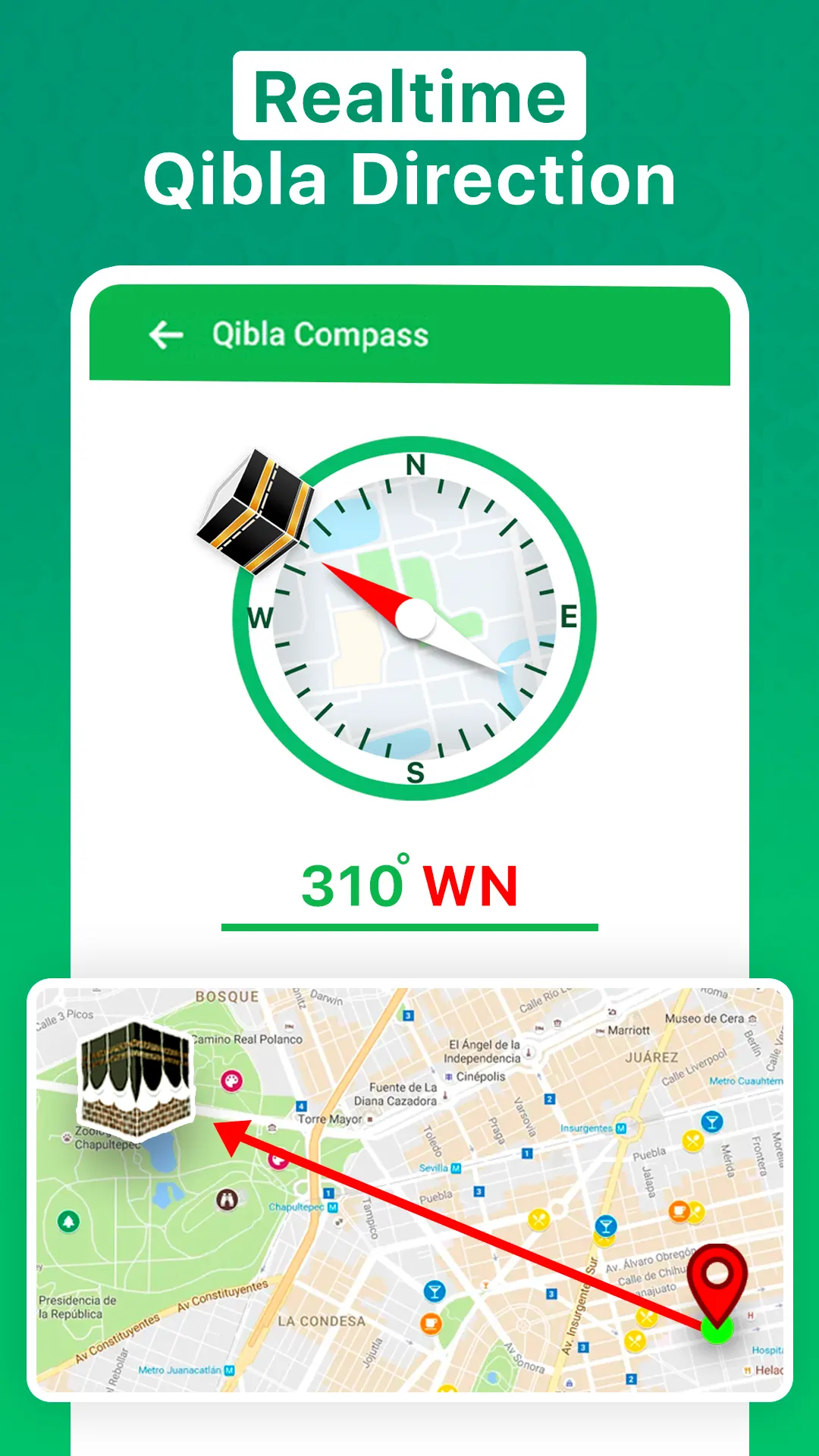 - GPS-отслеживание в реальном времени для точного указания направления Киблы.
