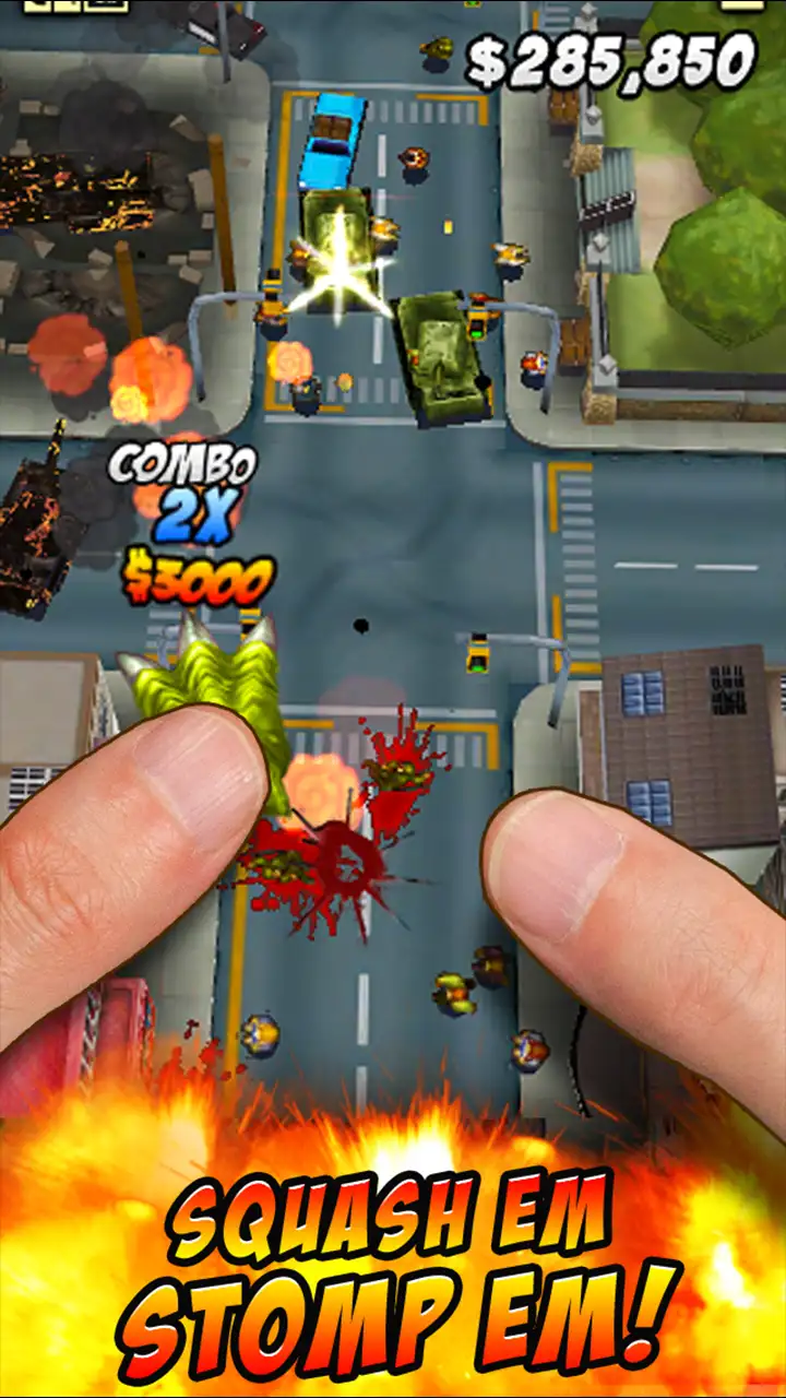 Сносите здания, давите машины, разбрасывайте танки и топчите испуганных жителей. Но будьте осторожны — город не сдастся без боя! Полиция, солдаты, броневики, танки и боевые вертолеты готовы дать отпор.