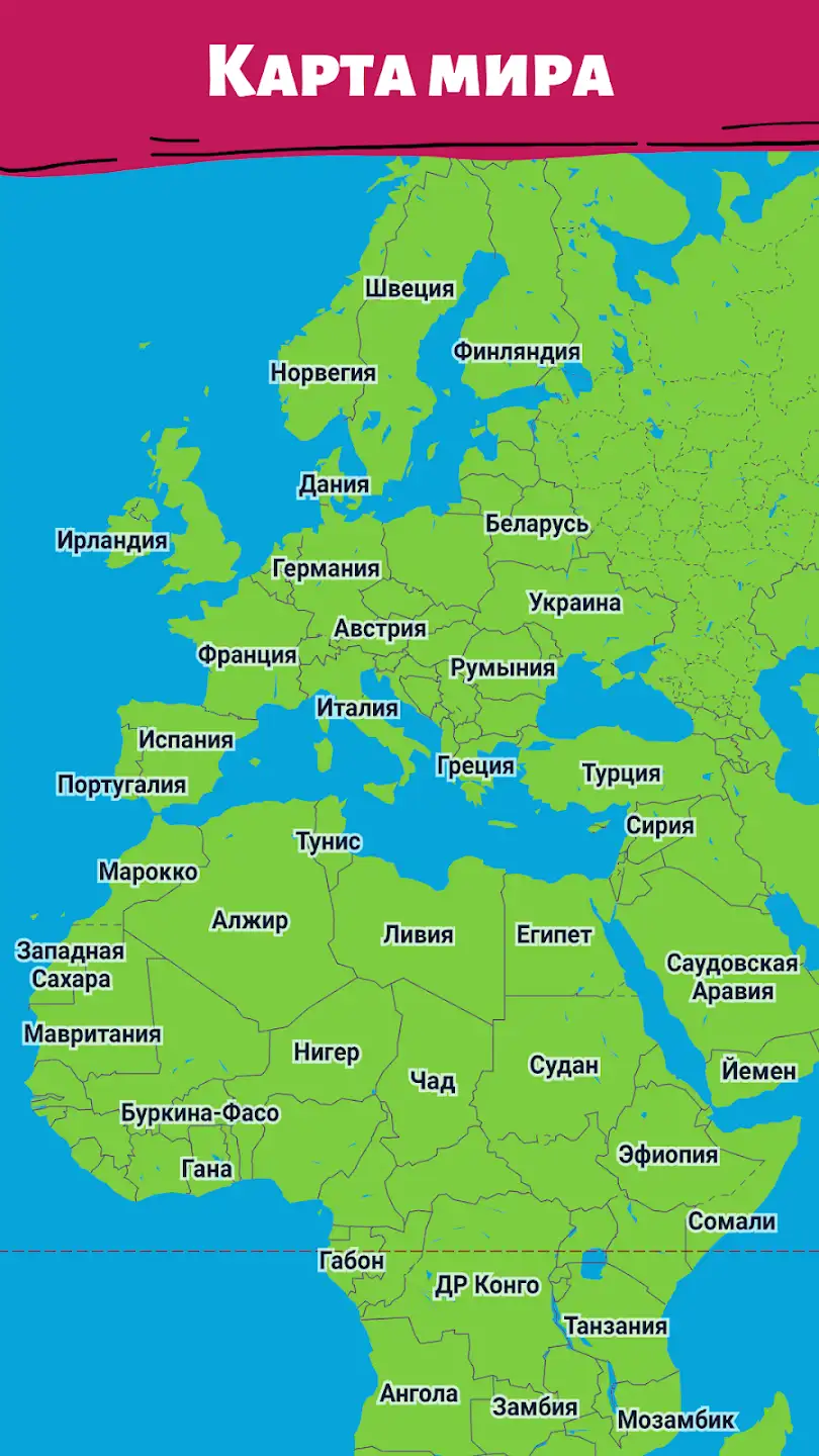 Открывайте для себя Европу, Азию, Африку, Америку и Океанию, а также узнавайте больше о странах, расположенных на этих континентах.