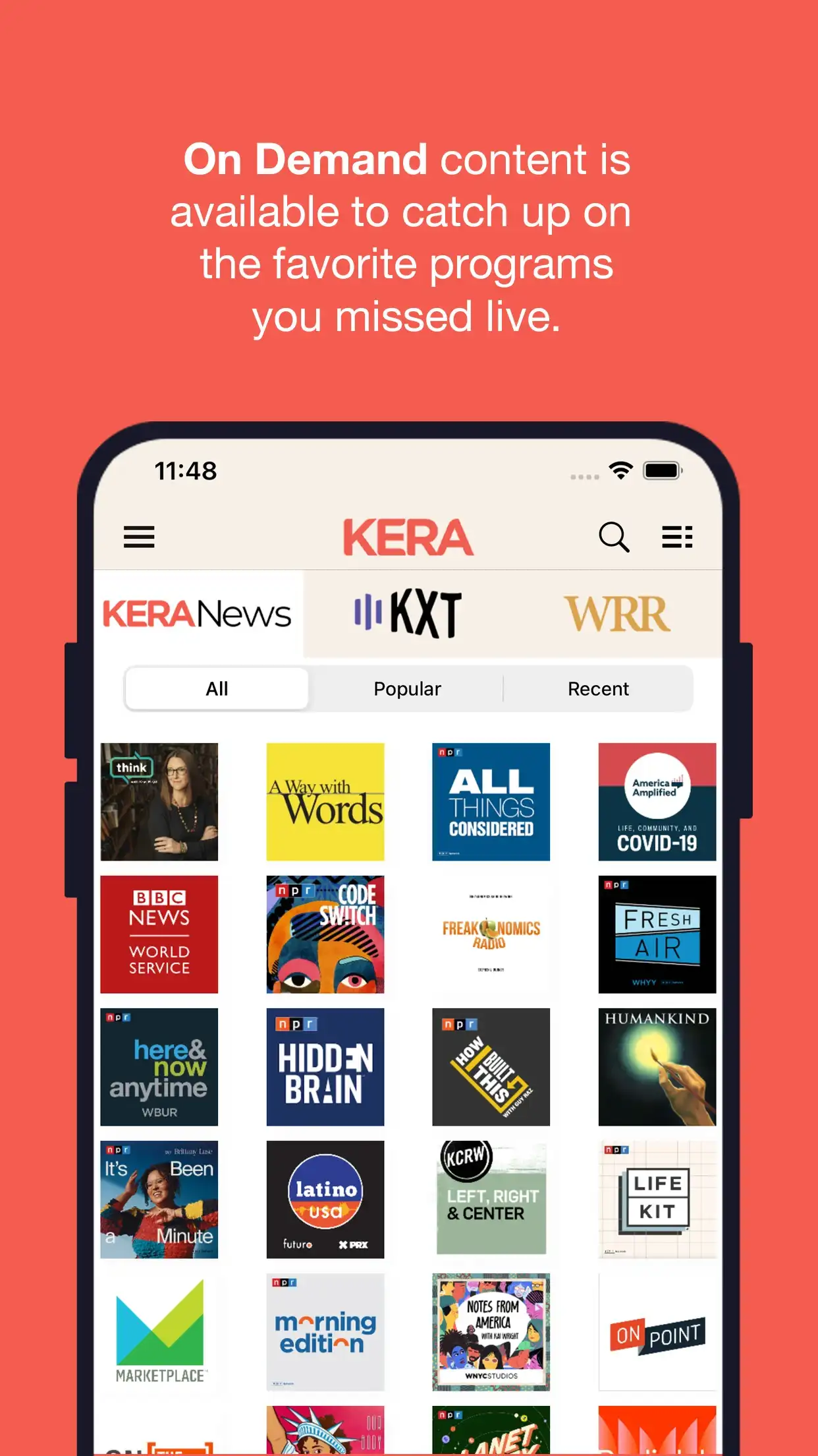 Приложение KERA позволяет слушать программы в прямом эфире и по запросу, читать материалы KERA News, ставить трансляции на паузу и перематывать их на более ранний момент дня, а также просматривать расписание передач. Вы можете искать нужные программы и даже использовать приложение как будильник, чтобы просыпаться под эфир KERA!