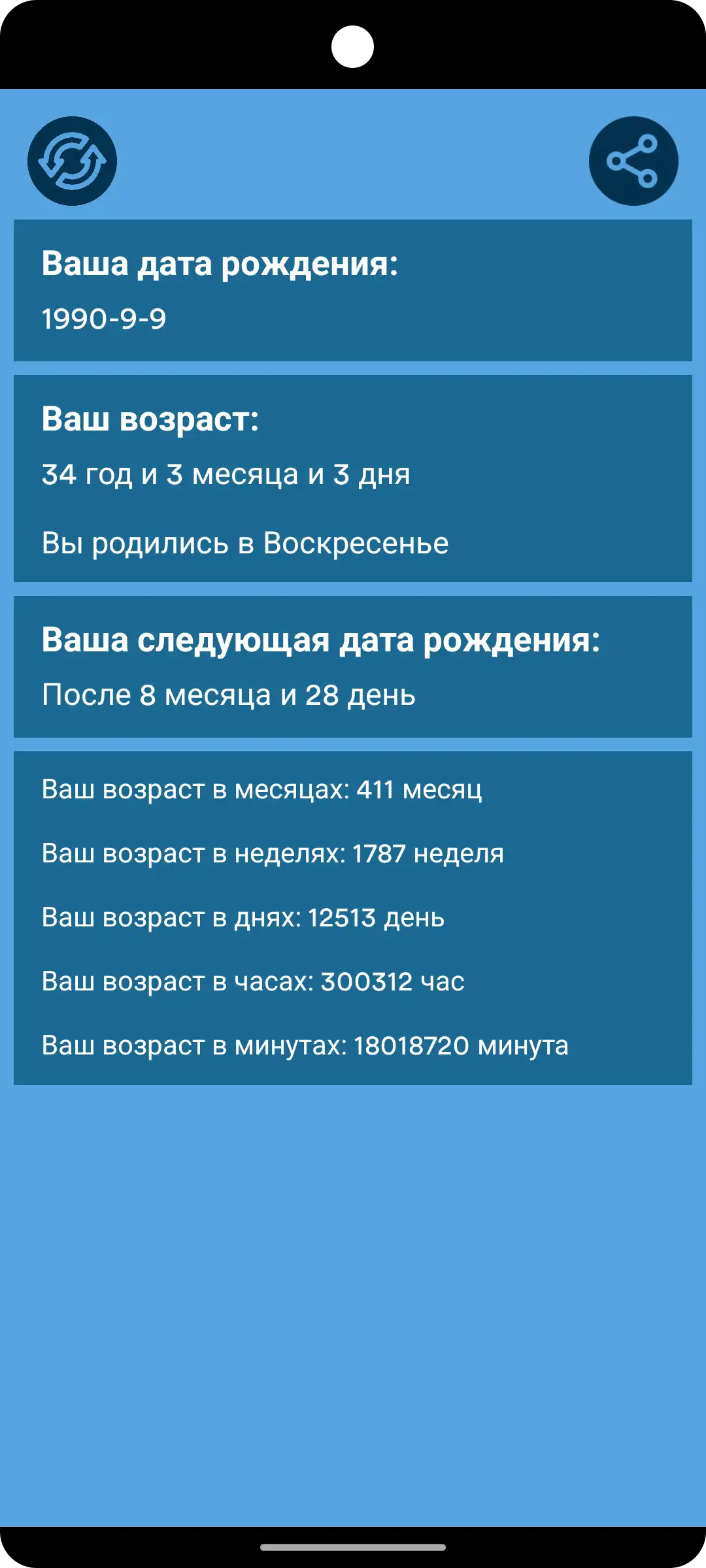 - Детальная информация – посмотрите свой возраст в месяцах, неделях, днях, часах и даже минутах!